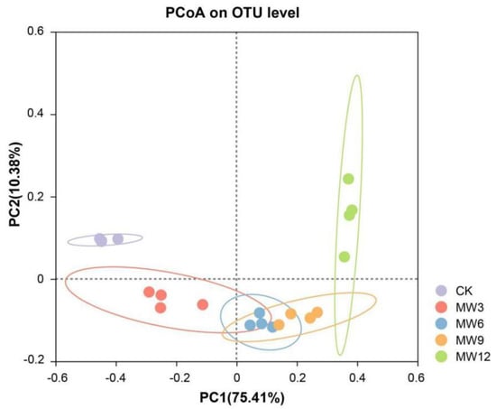 Principal coordinate analysis (PCoA) of the bacterial community structure based on Bray—Curtis distance. CK: control; MW3: microwave irradiation of the soil for 3 min; MW6: microwave irradiation of the soil for 6 min; MW9: microwave irradiation of the soil for 9 min; MW12: microwave irradiation of the soil for 12 min.