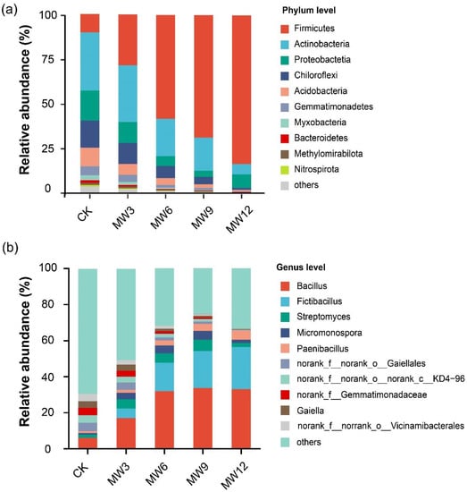 At the genus level, as shown in Figure 6b, the top five genera with high relative abundance were Bacillus, Fictibacillus, Streptomyces, Micromonospora, and Paenibacillus belonging to Firmicutes and Streptomyces and Micromonospora belonging to Actinobacteria. Five genera accounted for 9.6%, 32.5%, 60%, 69.2%, and 65.4% of all genera in the CK, MW3, MW6, MW9, and MW12 treatments, respectively. Compared to the CK treatment, the relative abundance of Bacillus increased 1.8-, 4.4-, 4.6-, and 4.5-fold under MW3, MW6, MW9, and MW12 treatments, respectively. Similarly, the relative abundance of Fictibacillus increased with increasing microwave time, 118-, 355-, 460-, and 526-fold under MW3, MW6, MW9, and MW12 treatments, respectively, compared to that in the CK treatment. The relative abundance of Streptomyces, Micromonospora, and Paenibacillus was lower under the CK treatment and higher under microwave treatment at 3, 6, 9 and 12 min. Compared to CK treatment, the relative abundance of Streptomyces increased 1.9-, 1.85-, 2.5-, and 0.2-fold in the MW3, MW6, MW9, and MW12 treatments, respectively; the relative abundance of Micromonospora increased 3.4-, 4.5-, 5.1-, and 1.2-fold in MW3, MW6, MW9, and MW12 treatments, respectively. The relative abundance of Paenibacillus increased 0.6-, 1.7-, 2.8-, and 3.9-fold in MW3, MW6, MW9, and MW12 treatments, respectively.