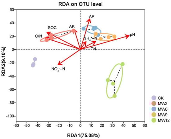 RDA analysis of community abundance at the level of bacterial OTUs was performed using CANOCO 5.0 software, and the maximum eigenvalue in the four axes was 2.64 > 3.5; thus, RDA in the linear model was selected. The effects of soil environmental factors on bacterial microbial communities are shown in Figure 7. Soil environmental factors were responsible for a total of 84.1% of the variation in soil bacterial communities, indicating that the RDA analysis successfully quantified the relationship between soil bacterial communities and soil chemical properties after microwave treatment, with the RDA1 and RDA2 axes accounting for 75.08% and 9.1% of the total variation, respectively (Figure 7). The MW6 and MW9 treatments were in the same quadrant and closer to the MW3 treatment, indicating some similarity in soil bacterial community abundance, while the MW12 treatment was farther away from the other treatments, indicating the uniqueness of its bacterial community structure. The length of the arrow pointing to the environmental factors expresses the magnitude of their influence on the bacterial community structure. The Mantel test further verified that the dominant factors affecting the soil bacterial community structure were soil pH (r = 0.837, p = 0.001), AP (r = 0.743, p = 0.002), SOC (r = 0.640, p = 0.015), and total nitrogen ratio (C/N; r = 0.590, p = 0.024), of which, C/N had a strong correlation with SOC (Table 4). Soil pH and AP were more strongly correlated with the MW6 and MW9 treatments, while soil C/N and SOC were more strongly correlated with the MW3 treatment (Figure 7).