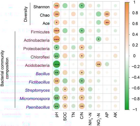 Correlation analysis between environmental factors and soil bacterial diversity at the phylum and genus level. *** p < 0.001, ** p < 0.01, * p < 0.05. The red regular font represents the bacterial phyla. The blue italic font represents the bacterial genera.
