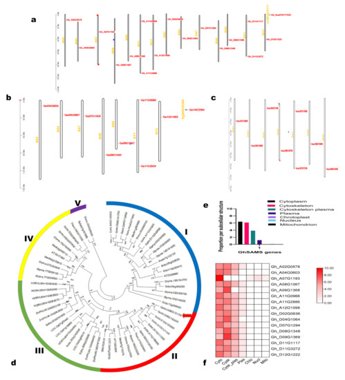 The phylogenetic analysis of GhSAMS proteins and SAMS proteins from other related species was performed to examine their relationships (Figure 1d). The results indicated that SAMS proteins could be classified into five major groups (I–V). The Group III genes were all from monocotyledonous plant species, while the genes from the dicotyledonous plant species were scattered across all four groups. GhSAMS genes were classified into groups I, II, and IV, where they showed a high degree of similarity with the SAMS genes from soybean, T. cacao, and M. truncatula (Figure 1d). The subcellular localization analysis showed that SAMS proteins are located mainly in the cytoplasm and cytoskeleton of G. hirsutum cells (Table 2; Figure 1e,f).