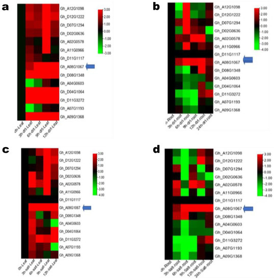 Heat maps showing GhSAMS genes’ differential expression in G. hirsutum under drought and salt stress conditions. RT-qPCR analysis of the expression of GhSAMS genes under drought stress in the leaf (a) and roots (b). RT-qPCR analysis of the expression of GhSAMS genes under salt stress in the leaf (c) and roots (d). The higher expression level, the lower expression level, and no expression of the GhSAMS genes at a particular time are depicted by red, green, and black colors, respectively.