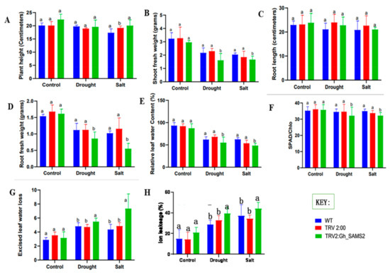 VIGS and WT plants’ physiological and morphological traits analyzed under the conditions of drought and salt stress. (A) Plant height. (B) Shoot fresh weight. (C) Root length. (D) Root fresh weight. (E) Relative leaf water content. (F) Leaves’ chlorophyll content. (G) Excised leaf water loss. (H) Ion leakage in the leaf. TRV2:00, Positive control; WT, Wild type; and TRV2:GhSAMS2, VIGS plants. Different letters above the bars indicate statistically significant differences at p < 0.05.