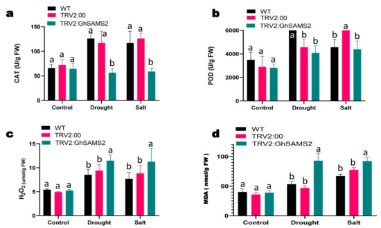 We further analyzed biochemical parameters, including malondialdehyde (MDA) and H2O2 contents and the activity of antioxidant enzyme peroxidase (POD) and catalase (CAT). The contents of MDA and H2O2 in the TRV2:GhSAMS2 plants were significantly higher than those in the WT under the drought and salt stress conditions (Figure 5c,d). Supportively, the antioxidative activities of POD and CAT were significantly lower in the VIGS plants compared to those in the WT under the conditions of drought and salt stress (Figure 5a,b).