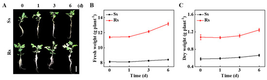 Bottle gourd rootstock enhanced the salt stress tolerance of the grafted watermelon seedlings. (A) Plant phenotype. Bar: 5 cm. (B) Fresh weight. (C) Dry weight. Watermelons grafted onto watermelon (Ss) and bottle gourd (Rs) were treated with 100 mM NaCl, and the phenotype, fresh weight, and dry weight were measured at the indicated time points. The data represent the mean ± SD (n = 3).