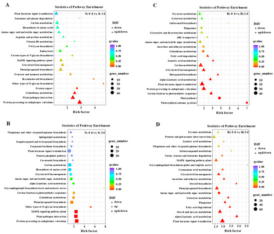 KEGG pathway analysis of DEGs in self-grafted (Ss) and bottle gourd rootstock-grafted (Rs) watermelon seedlings exposed to 100 mM NaCl for 0, 1, and 3 d. (A) KEGG pathway analysis of the Ss 0 d vs. Ss 1 d group. (B) KEGG pathway analysis of the Ss 0 d vs. Ss 3 d group. (C) KEGG pathway analysis of the Rs 0 d vs. Rs 1 d group. (D) KEGG pathway analysis of the Rs 0 d vs. Rs 3 d group.