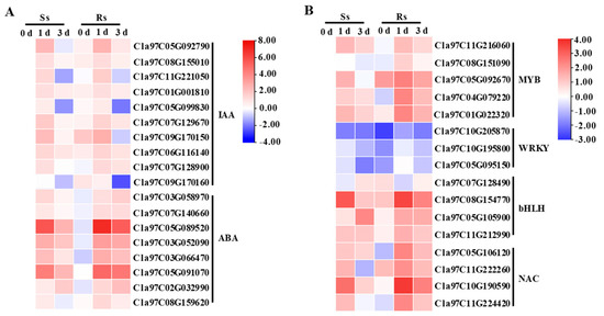 Heatmap analysis of DEGs involved in plant hormone (A) and stress response transcription factors (B). Data in the heatmap originated from transcriptomic results after log2 transformation.