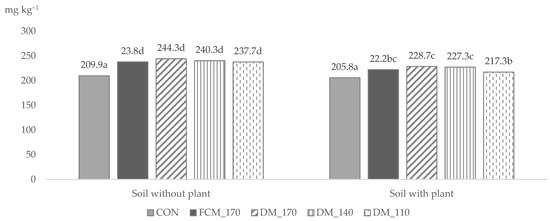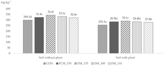 In our study, the available P2O5 content of soils without crops differed insignificantly between liquid cow manure (N170) and digestate (N170) (Figure 1): 73.9 and 88.9 kg ha−1 of available P2O5 were added in the former and 88.9 kg ha−1 in the latter case. This is in line with the findings of Barłóg et al. [55]: “fertilization did not have any significant influence on the content of plant-available phosphorus in soil in any year of the study, regardless of the soil depth, comparing digestate with cattle manure”. Similar trends were also found by Vago et al. [56]. In their study, the slight change in available P2O5 in the soil was probably due to the high pH values of the digestate (Table 1), which led to an increase in the chemical sorption of phosphorus compounds taken up by plants. The lower rates of digestate (N140 and N110) resulted in a tendentious, but not significantly, lower content of available P2O5 in the soil compared to the N170 digestate rate.