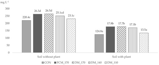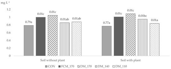 Potassium is another biogenic element that can be leached into deeper layers of the soil or even into drainage or groundwater in the event of excess precipitation, unused by plants and not consumed by the soil [63]. In the present study, the highest leaching of potassium was observed in soils fertilized with liquid cow manure, while substantially lower content was observed in soils fertilized with digestate. When spring wheat was grown, the potassium content of the soil leachate was significantly lower compared to soils without plants (Table 4). Under crop cultivation, potassium content was significantly lower in the leachate of soils fertilized with N140 and N110 digestate.