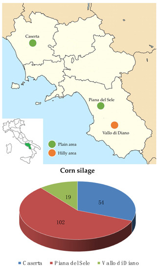 From July to December of 2020, a total of 175 samples of corn silage were collected. All the samples were produced in the farm, wherein the corn plant (hybrid PR31Y43, Pioneer Hi-Bred Italia, S.r.l., Gadesco Pieve Delmona, Cremona, Italy) was grown on the area located in three sites of Campania region (in the South Italy), according to the distribution reported in Figure 1:
