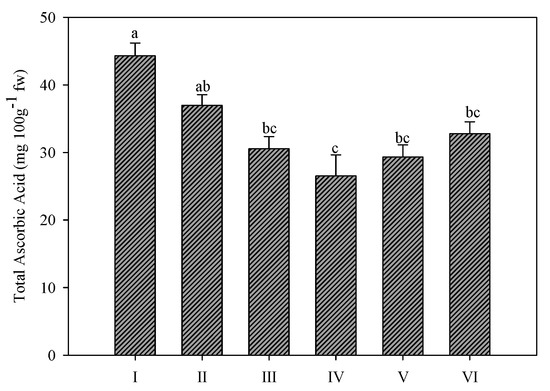 2.4.3. Total Ascorbic Acid, Chlorophyll a and b and Carotenoids