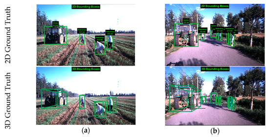 This paper refers to the driving of autonomous vehicles; this kind of application requires real-time object detection to ensure safe driving, which is consistent with the need for the sensing of obstacles by autonomous agricultural machines in farming work. By referring to the standards provided by the KITTI Vision Benchmark Suite [18]—a benchmark dataset for autonomous vehicle driving—we generated a 3D obstacle-detection dataset for agricultural scenarios. After the data preprocessing operation in Section 2.1.3, the temporally and spatially synchronized multisource data were obtained. Then, the annotation of images and point clouds was performed using the Bayside annotation software, and the fusion annotation-required camera parameters, which could be obtained from the aforementioned calibration results of the LiDAR and camera. As shown in Figure 3, the labeling was based on the calibration parameters, and the point cloud was labeled with a 3D box (Figure 3a), which could be automatically mapped to the 2D image (Figure 3b) to generate a rectangular box. These 2D images were later processed to generate labels, and they were also better for visualizing the labeling results.