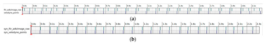 Comparison of the results of multisensor time synchronization: The horizontal axis represents the time, the vertical axis is the sensor topic name, flir_adk/image_raw represents the image data collected by the camera, and velodyne_points represents the point cloud data collected by the LiDAR. (a) Unsynchronized multisensor timestamps. (b) Synchronized multisensor timestamps.
