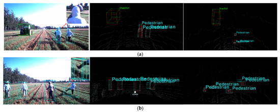 Occlusion and multiple poses of the detected obstacles cause difficulty in extracting features, resulting in failed obstacle detections. On the one hand, the occlusion between obstacles—such as the overlap of moving pedestrians—causes the LiDAR‘s laser beams to fail to reach the occluded objects, leading to the sparseness of the obtained point cloud data, which makes the feature extraction process more difficult and, ultimately, leads to missed detection or reduced accuracy. On the other hand, the protruding limbs of some pedestrians with multiple postures can be mistakenly detected as pedestrians. This is mainly because the pedestrian itself is a small target and the point cloud data are sparse, so the learned features are not very distinguishable, and it is easy to mistakenly detect some other relatively small targets for pedestrians—such as human thighs—leading to the false recognition of irrelevant information. It is worth noting that although only two types of obstacles (i.e., pedestrian and tractor) have been tested so far, we have established a method to detect specific categories of obstacles for autonomous agricultural machines, and this method could be applied to more types of obstacles if necessary.