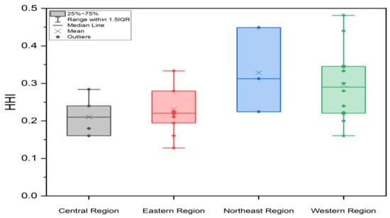 Figure 4. Regional differences in Herfindahl–Hirschman Indices (HHIs) in four regions in China. Note: Central Region: Shanxi, Henan, Anhui, Hubei, Jiangxi, and Hunan; Eastern Region: Hebei, Beijing, Tianjin, Shandong, Jiangsu, Shanghai, Zhejiang, Fujian, Guangdong, and Hainan; Northeast Region: Heilongjiang, Jilin, and Liaoning; Western Region: Chongqing, Sichuan, Shaanxi, Yunnan, Guizhou, Guangxi, Gansu, Qinghai, Ningxia, Tibet, Xinjiang, and Inner Mongolia.