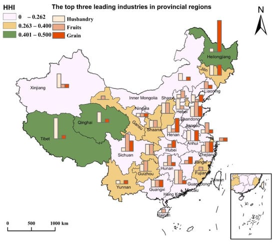 There is homogeneity in the leading industry category of NMAIPs, which provides problems [4,6]. The HHI index is used to further explore the geographical concentration of the leading industries in each province. The HHI of NMAIP industries in each province ranges from 0.128 to 0.5, with types such as low oligopolistic and highly oligopolistic, indicating that the homogenization of leading industries in NMAIPs exists widely in each province. The main industrial of concentration are husbandry, fruits, and grain. The degree of competition and homogenization of the same industrial categories varies among different regions of NMAIPs. The optimal allocation of leading industries can be achieved by both increasing the number of leading industries in the park and adjusting the structure of industry categories.