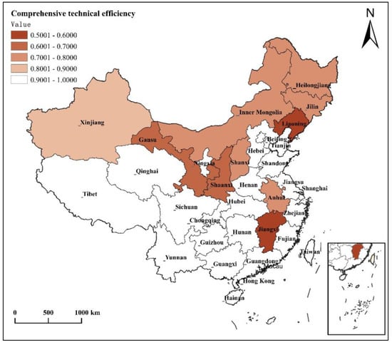 On the whole, the average value of the comprehensive technical efficiency (TE) value of NMAIPs is 0.90, which is high but not optimal. Among them, 21 provinces have a comprehensive efficiency value of 1.00, accounting for 67.74%, which indicates that the operation of NMAIPs in these provinces is effective. The other 10 provinces have a technical efficiency value of less than 1, accounting for 42.96%. Among them, as shown in Figure 7, the TE values of Liaoning and Jiangxi are 0.5–0.6; Gansu and Shaanxi are 0.6–0.7; Anhui, Inner Mongolia, Jilin, Shanxi, and Heilongjiang are 0.7–0.8; and the TE value of Xinjiang is higher but less than 0.9.