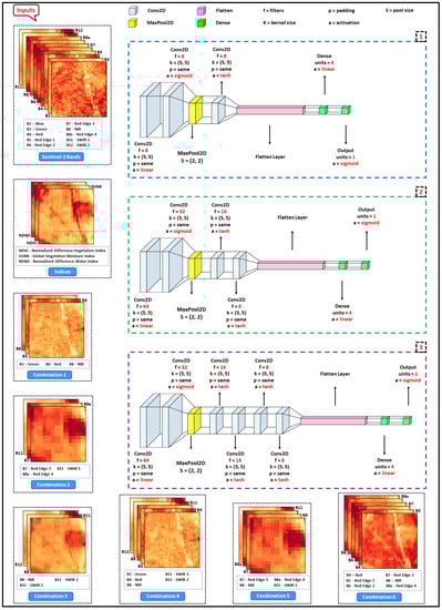 We conclude from the above reported results that selecting specific bands and using them as input data for the CNN model is better than using indicators or a single Sentinel-2 band and also is better than using all Sentinel-2 bands at once. This result is consistent with the observations of [19]. The perfect three inputs for the CNN architecture (3) are the fourth combination, the fifth combination, and the sixth combination.