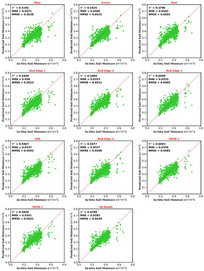 Figure 3 summarizes the results of using Sentinel-2 bands as input data for CNN algorithm (CNN architecture (3)) on soil moisture retrieval accuracy. Scatter plots in the figure illustrate relations between in-situ soil moisture and predicted soil moisture by the proposed CNN algorithm. Initially, each band separately was used as input data for the CNN, and then all Sentinel-2 bands together (10 bands) were used.