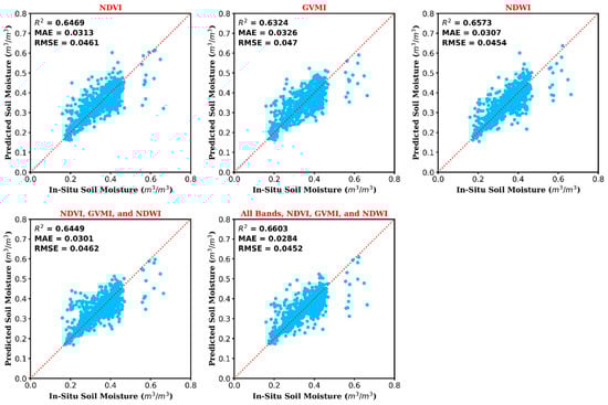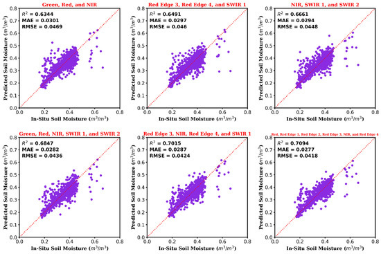 The results indicate that bands at 20 m spatial resolution are better than bands at 10 m spatial resolution. Merging NIR and SWIR bands increased the accuracy of soil moisture retrieval. This result is consistent with the results of [40,45]. Combining SWIR bands with bands at 10 m spatial resolution improved this result from () to (). The integration of Red Edge 3, NIR, Red Edge 4, and SWIR 1 bands positively affected soil moisture retrieval accuracy. Combining the Red, NIR, and Red Edge bands was successful and even achieved the highest accuracy of soil moisture retrieval from Sentinel-2 images. In our view, we believe that the main reason for the success of the sixth combination is the addition of the Red Edge bands. The Red Edge bands are suitable and significant for estimating biophysical parameters [76,77,78,79,80]. Biophysical parameters are an indicator of the status and health of the plant. Therefore, in vegetation-covered areas, Red Edge bands can improve soil moisture retrieval accuracy. This result is similar to the findings of [37].