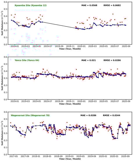 Soil moisture time series derived from the CNN architecture (3) for three locations. The black line with the blue points is in-situ soil moisture, and the red points are predicted soil moisture by the proposed CNN algorithm.