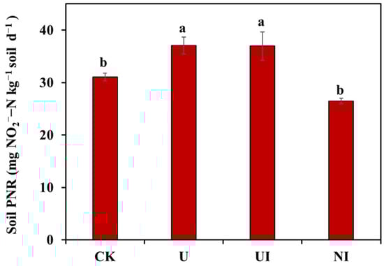 Soil PNR was 31.1 mg NO2−-N kg−1 soil d−1 in the CK treatment, and the U treatment had a significantly higher PNR than the CK treatment (Figure 1). The NI treatment reduced PNR by 28.6% compared to the U treatment (37.1 mg NO2−-N kg−1 soil d−1). However, there was no difference in the PNR observed between the UI- and U-treated soil. In addition, the PNR was positively correlated with cumulative N2O emissions (Table S3).