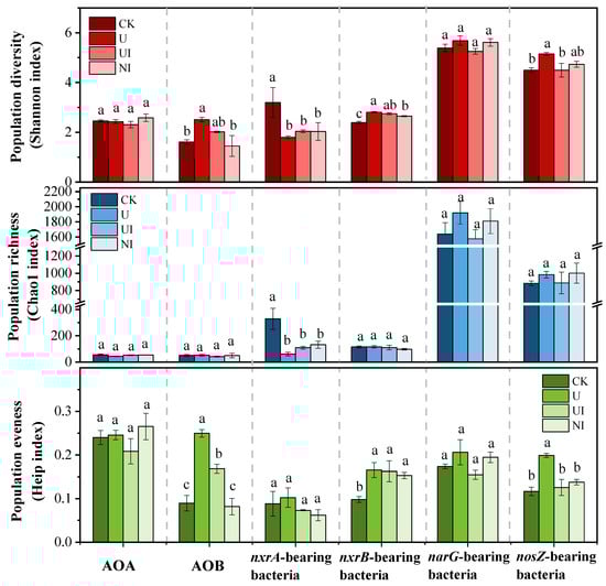 Diversity, richness, and evenness of AOA, AOB, nxrA-bearing, nxrB-bearing, narG-bearing, and nosZ-bearing bacterial population at the OTU level. CK: no nitrogen fertilizer application; U: urea; UI: urea with NBPT; and NI: urea with DMPP. Error bars represent standard errors of three replicates. Different letters above the bars indicate a significant difference at p < 0.05.