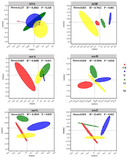Non-metric multidimensional scaling (NMDS) analysis at the OTU level of AOA, AOB, nxrA-bearing, nxrB-bearing, narG-bearing, and nosZ-bearing bacterial population. Treatments were as follows: CK: no nitrogen fertilizer application; U: urea; UI: urea with 0.4% NBPT; and NI: urea with 1% DMPP. The additional stress values at the top are the results of analyses of similarities (ANOSIM) with 999 permutations.