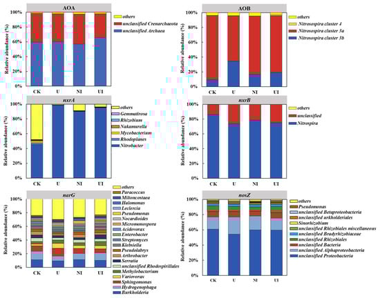 The relative abundance of AOA, AOB, nxrA-bearing, nxrB-bearing, narG-bearing, and nosZ-bearing bacterial populations across four treatments on the genus level (relative abundance > 0.01%). Treatments were as follows: CK: no nitrogen fertilizer application; U: urea; UI: urea with NBPT; and NI: urea with DMPP.