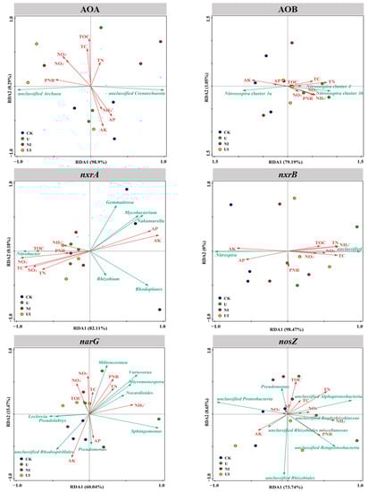 Redundancy analysis (RDA) illustrating the relationship between environmental variables and the main genera of AOA, AOB, nxrA-bearing, nxrB-bearing, narG-bearing, and nosZ-bearing bacterial populations. The red arrows indicate different environmental factors. The green arrows indicate different genera. PNR: potential nitrification rates; TC: total soil carbon; TN: total soil nitrogen; TOC: total soil organic carbon; AP: available soil phosphorus; AK: available soil potassium; NH4+: ammonium nitrogen; NO2−: nitrite nitrogen; and NO3−: nitrate nitrogen.