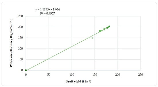The plant height (PH) was strongly positively and significantly correlated with the number of flower clusters per plant (NFCP), the number of fruits per plant (NFP), the fruit yield (FY), and the water use efficiency (WUE). The results in Table 10 indicate that the number of side shoots per plant (NSS) was positively correlated with all of the other parameters studied here. The number of flower clusters per plant (NFCP) was strongly positively correlated with the plant height (cm), the number of fruits per plant (NFP), the average fruit weight (AFW), the fruit yield (FY), and the water use efficiency (WUE). The correlation analysis of the tomatoes revealed that the plant height (PH), the number of flower clusters per plant (NFCP), the number of fruits per plant (NFP), the average fruit weight (AFW), and the water use efficiency (WUE) were strongly positively and significantly associated with the fruit yield (FY). The ascorbic acid (AA) revealed a positive and significant correlation with the number of side shoots (NSS), the number of flower clusters (NFCP) and the number of fruits per plant, and the average fruit weight (AFW), whereas it shows a non-significant correlation with the plant height (PH) and the water use efficiency (WUE). Furthermore, a strong relationship between the fruit yield and WUE was evident over all the fertigation and scheduling treatments (Figure 1).