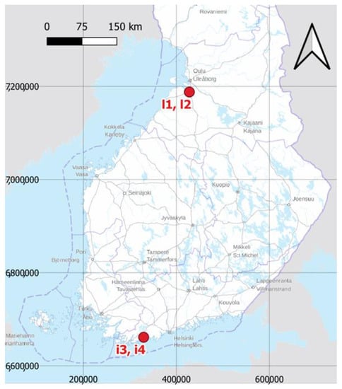 The locations of the study fields in southern and northern Finland (ETRS-TM35FIN). Fields i3 and i4 were located in a hemiboreal climate zone and growing zone I, and fields l1 and l2 were located in a middle boreal climate zone and growing zone V [,].