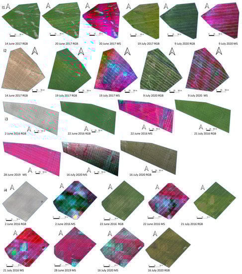 Drone data were geometrically processed using photogrammetry and structure-from-motion (SfM) algorithms, described, for instance, by Wu et al. [], and for the FGI2012b camera data, the processing followed the pipeline described by Näsi et al. []. The drone data were mainly collected under stable illumination conditions, but if partially cloudy images occurred, they were excluded from the orthomosaic calculations to produce radiometrically uniform orthomosaics (Figure 2). Orthomosaics were additionally converted to reflectance values, utilizing reference panels with nominal reflectance values of 0.05, 0.10, and 0.50 to ensure that different datasets were comparable. In the next phases of this study (statistical analysis), only one band of each camera was used as there was no significant difference between the results for each band. From the RGB datasets, the green band was selected, and from the MS datasets, the NIR band was selected. The spectral responses for all RGB cameras were typical of consumer cameras; additionally, the center wavelength was close to 530 nm, and the FWHM (full width at half maximum) was 100 nm [,]. The center wavelengths of the NIR bands were 790–840 nm, and the FWHM was 10–40 nm. The selected bands were considered to best indicate the amount of vegetation in the fields. The crops in the fields were in different growth stages, and especially in datasets collected before mid-June in I2, i3, and i4, the canopy was in the early growth stage, and bare soil was dominant instead of crop vegetation (Figure 2).