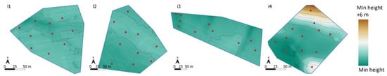 Locations of soil sampling points marked with red dots, and the topography (DTM produced from drone datasets) is visualized using a color scale (the minimum height for each parcel is presented in Table 1) and contour lines with 1 m intervals for the four study fields (l1, l2, i3, and i4).