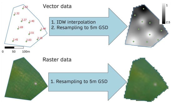 The data preprocessing pipeline is shown in Figure 4. To study the variation in the entire field, the soil parameters collected from 10–12 points around the fields were interpolated to create thematic raster maps for the entire field. We selected the inverse distance weighting (IDW) spatial interpolation method, following the guidelines given by Li and Heap []. We also considered the geostatistical method of ordinary kriging and, based on variograms, the soil samples followed spatial autocorrelation; however, due to the small number of samples, this structure was not always clear. We used classical IDW [] with a distance coefficient of p = 2, which is the most commonly used version of IDW [] and which provided visually suitable results. Radočaj et al. [] also observed similar interpolation accuracy for soil parameters using ordinary kriging and IDW.
