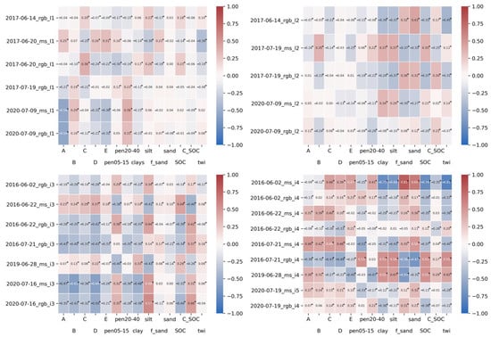 The correlation coefficients between drone datasets and soil properties for all datasets collected in experimental fields l1, l2, i3, and i4. * indicates that the correlation was significant based on the Wald Test with t-distribution (p < 0.05). A = topsoil biological indicators, B = subsoil macroporosity, C = compacted layers in soil profile, D = topsoil structure, E = subsoil structure, pen05–15 = mean soil penetration resistance in the 5–15 cm layer, and pen20–40 = in the 20–40 cm layer, SOC = soil organic carbon content, C_SOC = clay/soil organic carbon ratio in the 0–20 cm layer.