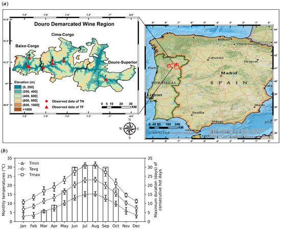 The spatial distribution of (a) study sites (numbered per Table 1) where the phenology data of two grapevine varieties (TF: Touriga Franca, TN: Touriga Nacional) are collected within the Douro Demarcated Wine Region and (b) the monthly mean of daily minimum (Tmin, °C), average (Tavg,°C) and maximum (Tmax, °C) temperatures over 1991−2020 (error bars: standard deviation of monthly means), along with the maximum duration (days) of consecutive hot days (Tmax ≥ 25 °C for at least 5 days) for each month. The meteorological statistics are based on the spatial average of all study sites.