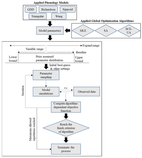 All the phenology models were written in python according to Equations (1)–(6). Numpy (v1.21.2), Panda (v1.3.4), Matplotlib (v3.4.3) and Statsmodels (v0.13.1) were involved in the data processing, statistical analysis and result visualization. For the parameter optimization procedures illustrated in Figure 2, the open source python package of Statistical Parameter Optimization Tool (SPOTPY, v1.5.14) was used [53]. SPOTPY provided a wide range of implementations for the parameter optimization algorithms for calibration, uncertainty and sensitivity analysis in a simple, independent, flexible and consistent environment [53].
