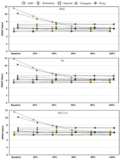 Root Mean Squared Error (RMSE) computed between five phenology model simulations of the optimum parameters obtained from three global optimization algorithms (MLE: Maximum Likelihood Estimation; SA: Simulated Annealing; SCE-UA: Shuffled Complex Evolution) and the corresponding observed flowering data of two dominant Portuguese grapevine varieties (Touriga Franca: filled orange symbols; Touriga Nacional: filled green symbols). The orange and green symbols are slightly displaced in the x-axis to avoid the symbol overlap. The analysis is carried out by gradually expanding the initially defined range of distribution for each model parameter (baseline settings) by up to 100% (the percentage in the x-axis corresponds to each expanded percentage test category). An expanded range of 20–100% corresponds to 120–200%, relative to the initial baseline range. The observed phenology data correspond to blended multi-vineyard observations within the Douro region in the period of 2014–2021.