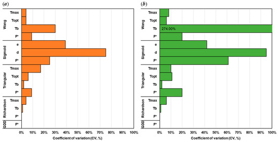 Coefficient of variation (CV, %) for obtained optimal parameter values among the three applied algorithms for (a) Touriga Franca (TF) and (b) Touriga Nacional (TN). These are obtained with the expanded lower and upper boundary of parameter distribution by 100%, relative to the baseline settings. The obtained individual parameter values are presented in Table S2. Note that the CV value for Tb parameter of the Wang model in TN is denoted as it exceeds 100%.