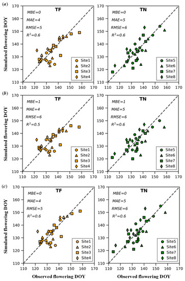 Comparison between observed flowering timing (DOY) and the median of the ensemble model simulations using optimized parameter values (Table S2) from (a) MLE, (b) SA and (c) SCE-UA. Touriga Franca (TF) and Touriga Nacional (TN) are denoted with orange and green symbols, respectively. Mean Bias Error (MBE), Mean Absolute Error (MAE), Root Mean Squared Error (RMSE) and the coefficient of determination (R2) are conventional statistics for evaluating the goodness-of-fit. The geographic locations of the study sites for each variety are presented in Figure 1 and Table 1. Evaluations for individual model simulations are shown in the supplementary material (Figures S2–S4).