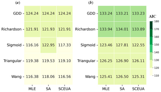 AIC shows a similar pattern to that of previous evaluation results (Figures S2–S4), where a better performance is found for TF than for TN, and different algorithms result in very similar results but with variations among models (Figure 6). For TF, the AIC values are, on average, about 123 for degree-day (GDD, Richardson) and 118 for non-degree-day (Sigmoid, Triangular and Wang) models, respectively (Figure 6a). For TN, they are, respectively, 134 and 126 for degree-day and non-degree-day models (Figure 6b). Small variations are generally found within each model type (Figure 6).
