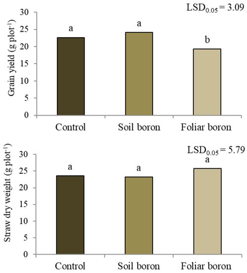The grain yield differed among the B application treatments (p < 0.05) (Figure 1). The control with no B and soil B application had grain yields of 23.4 g pot−1, while foliar B application decreased the grain yield by 14.9% compared with the control. No differences between the B applications were found in the straw dry weight (p < 0.05).