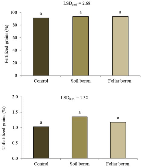 The percentages of fertilized and unfertilized grains among the unfilled grains of Sanpatong 1 rice variety grown under different boron fertilizer application treatments (no B fertilizer was added (control); B fertilizer was added in the soil at 19.9 kg ha−1 (soil boron) in the glasshouse experiment and B fertilizer was foliar sprayed at 500 L ha−1 (foliar boron)). Same letters above each bar (means) indicate no significant difference by the least significant difference (LSD) test at p < 0.05.