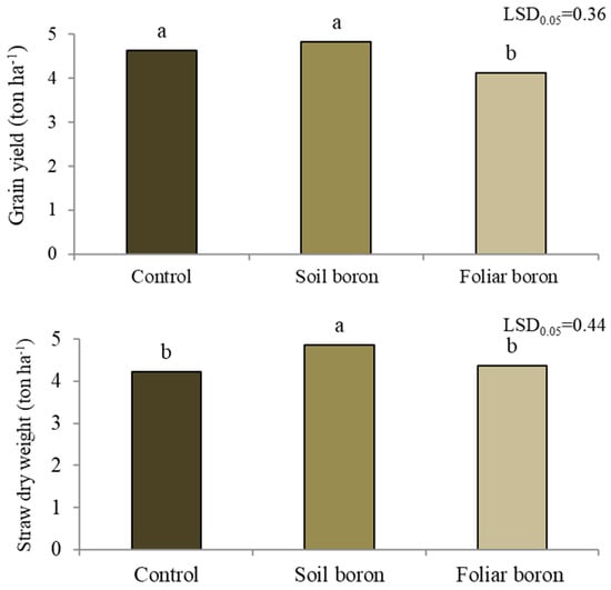 The grain yield differed among the B application treatments (p < 0.05) (Figure 3). The control with no B application and soil B application resulted in a grain yield of 4.7 t ha−1, while the applied foliar B decreased the grain yield by 10.9% compared with the control. The control and foliar B application treatments each had a straw dry weight of 4.3 t ha−1, while the soil B application increased the straw dry weight by 15% compared with the control.