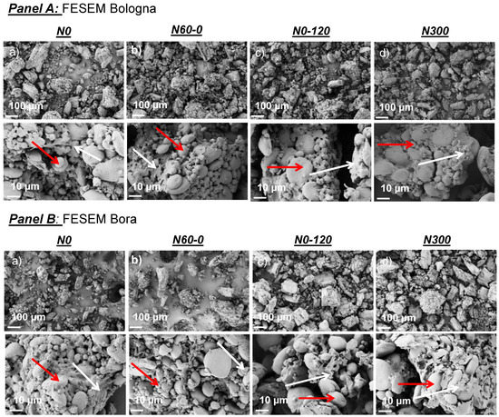 Field Emission Scanning Electron Microscopy (FESEM) images at two different magnifications of wheat flours for the two cultivars Bologna (Panel A) and Bora (Panel B) grown under four nitrogen fertilization schedules: (N0) (a), (N60-0) (b), (N0-120) (c), and (N300) (d). N0: unfertilized control; N60-0: N-fed only very early with 60 kg N ha−1; N0-120: N-fed only extremely late (i.e., at pollination) with 120 kg N ha−1; N300: continuously N-fed with five applications of 60 kg N ha−1 for a total of 300 kg ha−1. Red arrows identify starch granules, while white arrows identify the protein matrix.