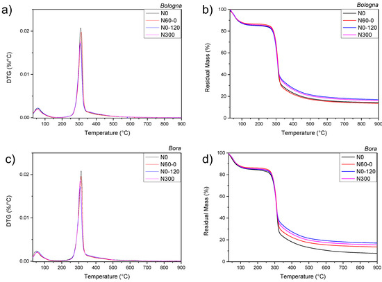 Thermogravimetric analysis (TGA) of wheat flour for the two cultivars Bologna (a,b) and Bora (c,d) grown under four nitrogen fertilization schedules (N0, N60-0, N0-120, N300). N0: unfertilized control; N60-0: N-fed only very early with 60 kg N ha−1; N0-120: N-fed only extremely late (i.e., at pollination) with 120 kg N ha−1; N300: continuously N-fed with five applications of 60 kg N ha−1 for a total of 300 kg ha−1. DTG: derivative thermogravimetry.