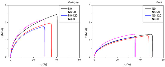 Stress–strain curves of tensile tests carried out on plasticized films obtained from wheat flours of two cultivars, Bologna (left) and Bora (right), grown under four nitrogen fertilization schedules (N0, N60-0, N0-120, N300). N0: unfertilized control; N60-0: N-fed only very early with 60 kg N ha−1; N0-120: N-fed only extremely late (i.e., at pollination) with 120 kg N ha−1; N300: continuously N-fed with five applications of 60 kg N ha−1 for a total of 300 kg ha−1. σb: tensile strength at break; εb: elongation at break.