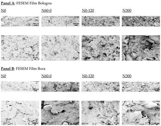 Field Emission Scanning Electron Microscopy (FESEM) images at two different magnifications of plasticized films from wheat flours of the two cultivars, Bologna (Panel A) and Bora (Panel B), grown under four different nitrogen fertilization schedules: (N0) (a), (N60-0) (b), (N0-120) (c), and (N300) (d). N0: unfertilized control; N60-0: N-fed only very early with 60 kg N ha−1; N0-120: N-fed only extremely late (i.e., at pollination) with 120 kg N ha−1; N300: continuously N-fed with five applications of 60 kg N ha−1 for a total of 300 kg ha−1.