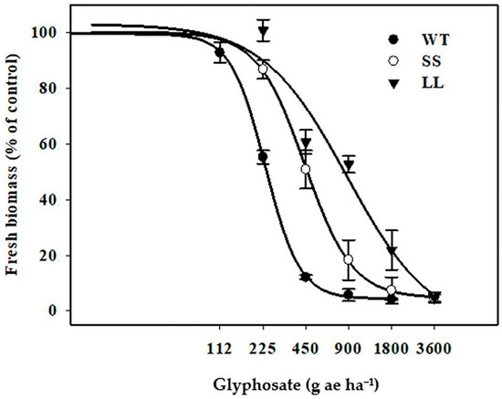 The biomass of the three goosegrass populations decreased with increasing glyphosate doses (Figure 1). At 14 DAT, all plants from the WT population were in a state of death with a dose of 900 g ae ha−1, whereas all plants of the GR populations (LL and SS) were killed by 3600 g ae ha−1 glyphosate (Figure 1). The GR50 values, indicating the herbicide doses required for 50% growth reduction in the LL and SS populations, were 878.3 and 442.6 g ae ha−1, respectively (Table 1). Compared with the WT population (GR50 = 233.1 g ae ha−1), the RIs of the LL and SS populations were 3.8 and 1.9, suggesting a moderate and low level of resistance, respectively.